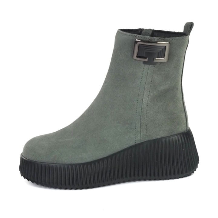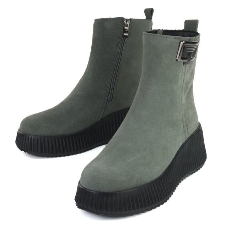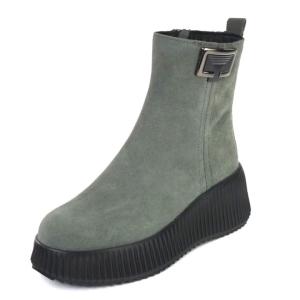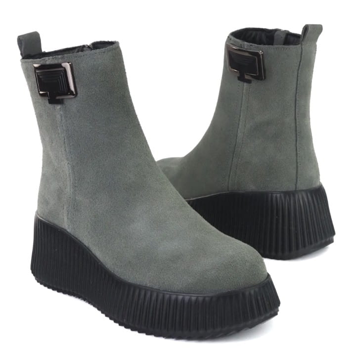 Skórzane, zamszowe botki damskie, znanej firmy Filippo. Cholewka wykonana jest z wysokiej jakości i miękkości skóry naturalnej zamszowej w kolorze szarym. Buty są ocieplone polarem i mają komfortową, miękką wkładkę. Zapinane są na suwak z boku. Modna podeszwa - platforma jest lekka, elastyczna i trwała. Wysokość podeszwy to 6,5 cm, a podsuwki 3,5 cm. Elegancka ozdoba z boku ładnie upiększa cholewkę.