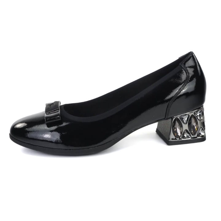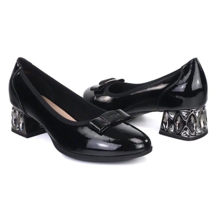 Czarne i eleganckie półbuty damskie marki Gino Fabiani. Cholewka wykonana jest z wysokiej jakości skóry naturalnej lakierowanej w kolorze czarnym. Miękka, komfortowa wkładka jest ze skóry naturalnej. Podeszwa jest elastyczna i trwała. Piękny, wygodny obcas ma wysokość 4,5 cm. Buty mają lamówkę na cholewce, która idealnie dopasowuje się do stopy. Śliczna, delikatna ozdoba z przodu dodaje uroku. Szykowne i gustowne czółenka będą ozdobą niejednej stylizacji. Idealne do codziennego użytkowania i na wielkie okazje...