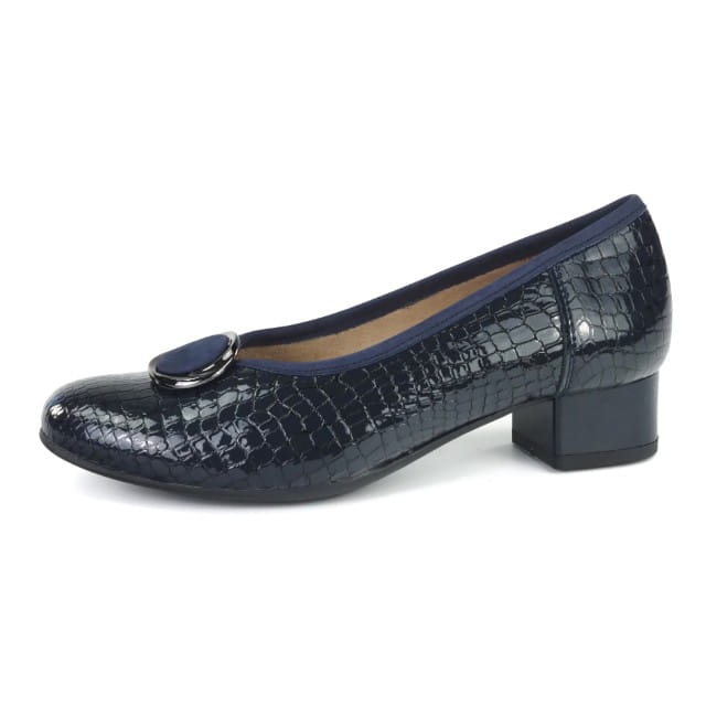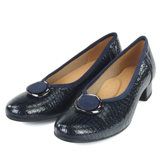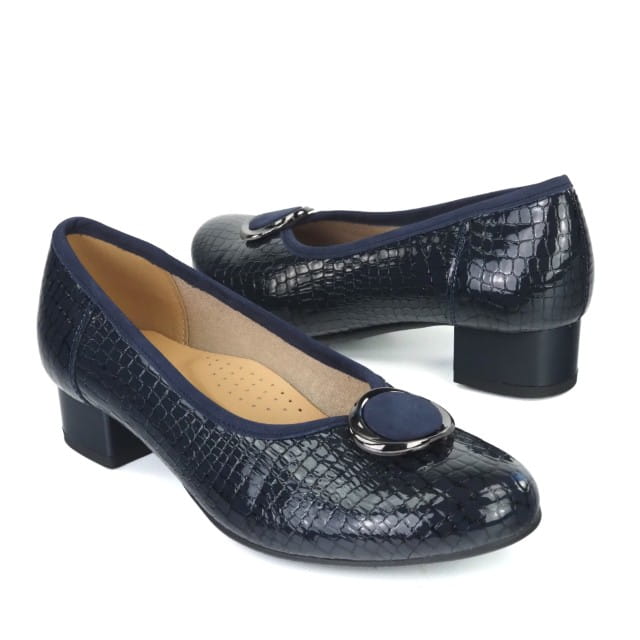 Granatowe i eleganckie półbuty damskie znanej polskiej firmy Galant. Cholewka jest wykonana z wysokiej jakości i miękkości skóry naturalnej, lakierowanej, karbowanej w ładnym, granatowym kolorze. Piękna ozdoba z przodu, zwiększa elegancki wygląd. W półbutach zastosowano wkładkę skórzaną RELAX SYSTEM, która podwyższa wygodę i komfort noszenia. Podeszwa FLEX jest bardzo miękka, elastyczna i trwała. Wygodny obcas ma 3,5 cm , sprawdzi się w codziennym użytkowaniu. Tęgość G1/2. Ładnie wykrojona cholewka wysmukla stopę. Inspirowane najgorętszymi trendami sezonu, pięknie prezentują się na nodze. Kobiecy styl.