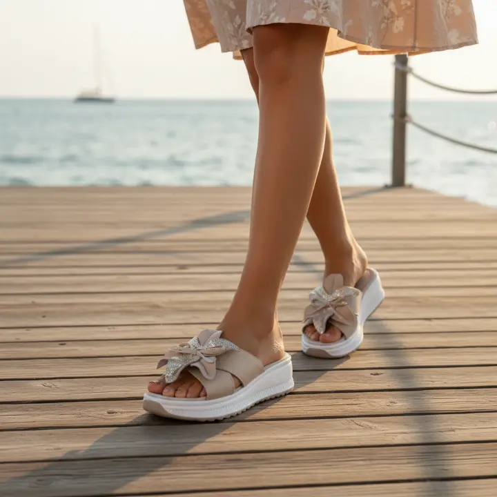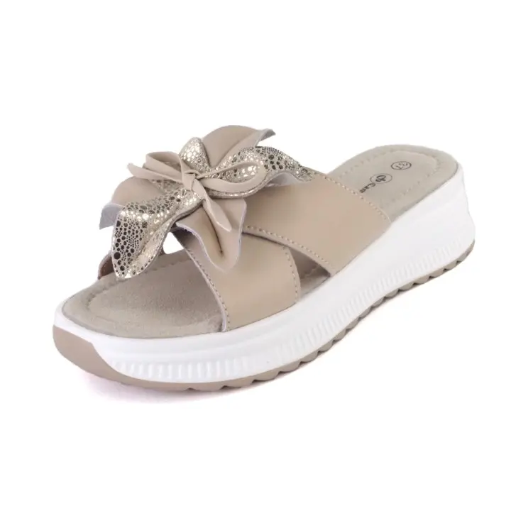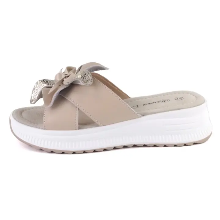 Beżowe, gustowne i modne klapki damskie znanej marki Cambell. Cholewka wykonana jest z wysokiej jakości skóry naturalnej licowej w kolorze beżowym . Komfortowa wkładka jest miękka i ze skóry naturalnej. Tegość G. Podeszwa jest modna, lekka i trwała. Wygodny klin ma 4,5 cm. Uroku dodaje śliczna ozdoba - kwiat z przodu. Inspirowane najgorętszymi trendami sezonu. Pięknie prezentują się na nogach. Będą pasować do wielu stylizacji.