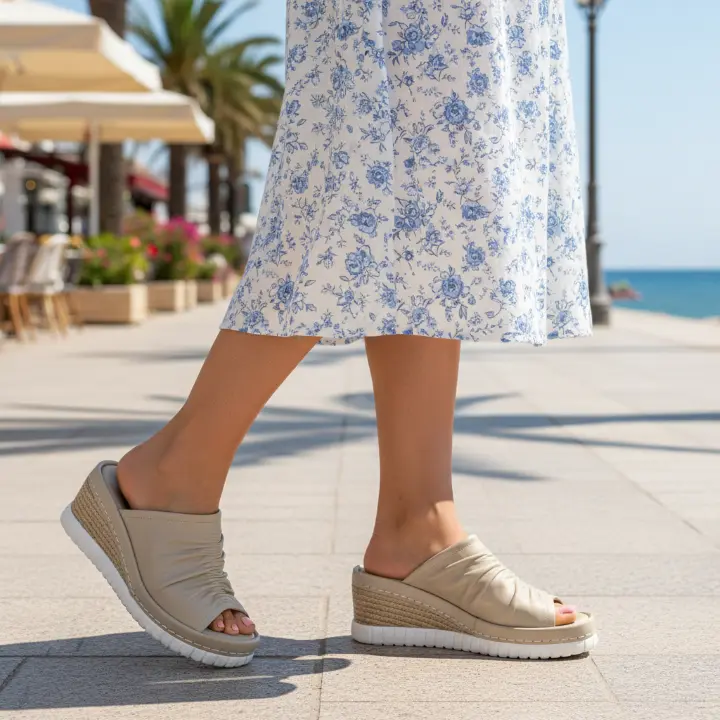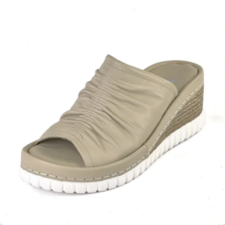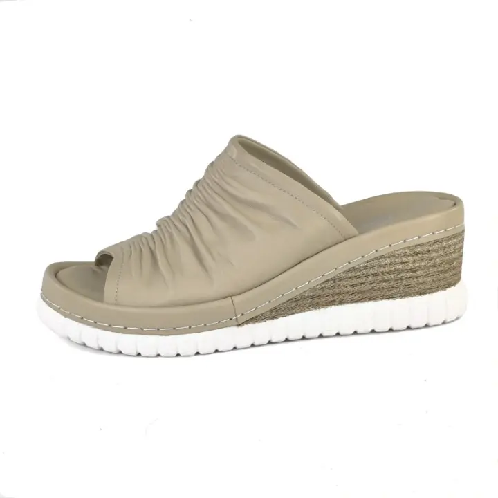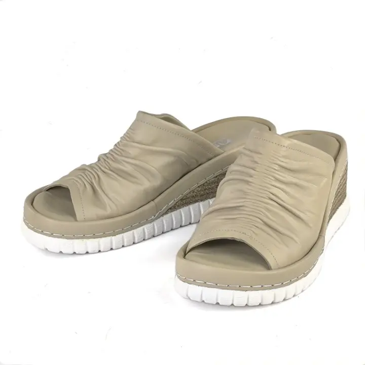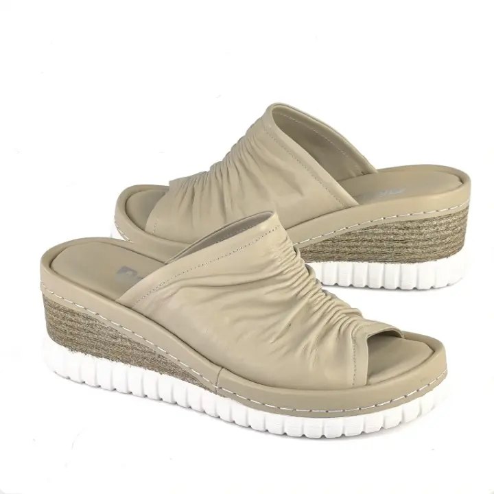 Beżowe, atrakcyjne i modne klapki damskie znanej marki Artiker. Cholewka wykonana jest z wysokiej jakości i miękkości skóry naturalnej w kolorze beżowym. Wygodę zapewnia bardzo miękka wkładka ze skóry naturalnej. Modna podeszwa jest elastyczna i trwala. Koturn ma wysokość 6,5 cm, a podsuwka 2,5 cm. Uroku dodaje ciekawie zmarszczona cholewka i dwukolorowy spód. Szykowne i wygodne klapki będą ozdobą niejednej stylizacji. Idealne do codziennego użytku i nie tylko...