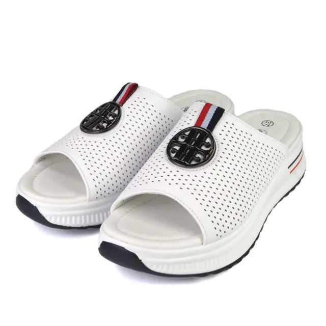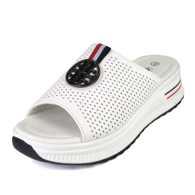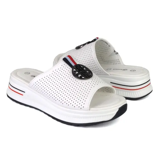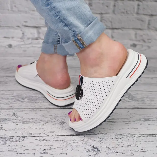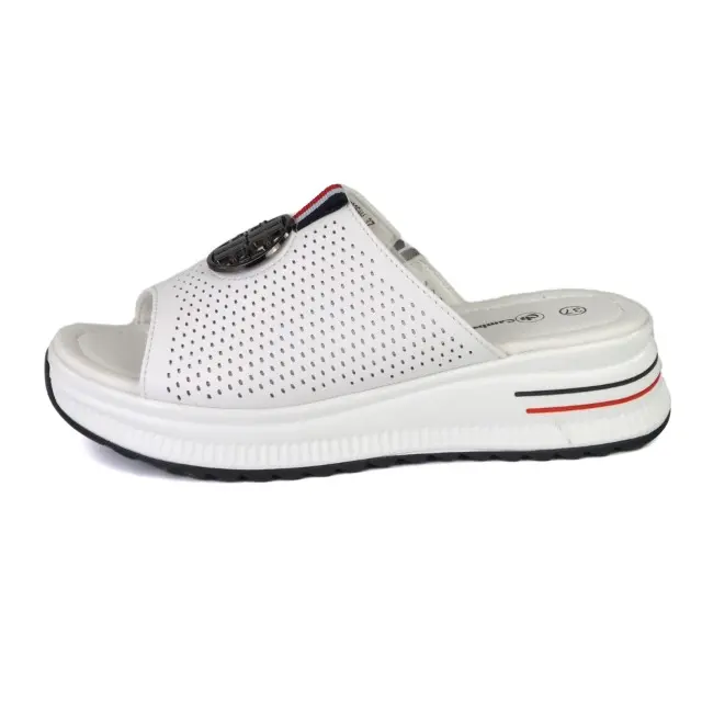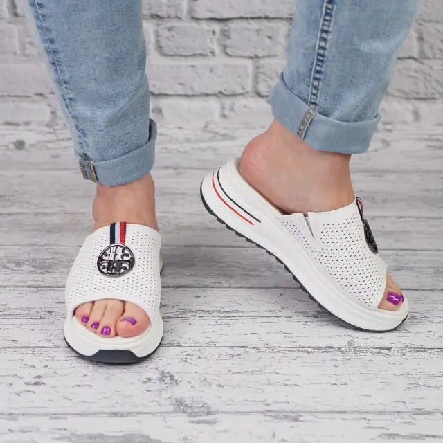 Białe, modne i wygodne klapki damskie znanej marki Cambell. Ażurowa cholewka wykonana jest z wysokiej jakości i miękkości skóry naturalnej licowej w kolorze białym. Komfortowa wkładka jest miękka i ze skóry ekologicznej. Tegość G. Podeszwa jest modna, lekka i trwała. Ładna ozdoba z przodu oraz granatowo-czerwone wstawki dodają uroku. Wygodny klin ma wysokość 4,5 cm. Ponadczasowe, stylowe klapki będą pasować do różnych stylizacji, będą także idealne do codziennego użytowania.