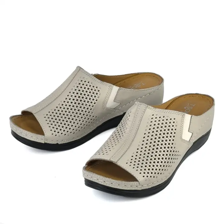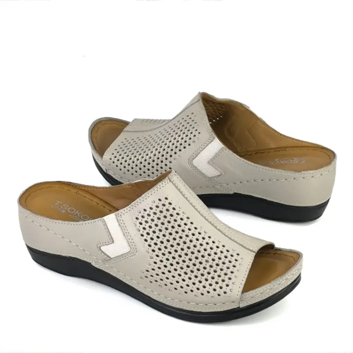 Szaro-beżowe, lekkie i komfortowe klapki damskie znanej marki T.Sokolski. Ażurowa cholewka jest wykonana z wysokiej jakości i miękkości skóry naturalnej w szaro-beżowym kolorze. Wyściółka jest skórzana. Wkładka jest miękka i ze skóry naturalnej. Podeszwa jest lekka, wykonana z wysokogatunkowego i elastycznego tworzywa. Wygodny koturn ma wysokość 5,5 cm. Buty mają dwie gumki po bokach, aby lepiej dopasować do stopy. Przyjemnie układające się na stopie klapki sprawdzą się w codziennym użytkowaniu.