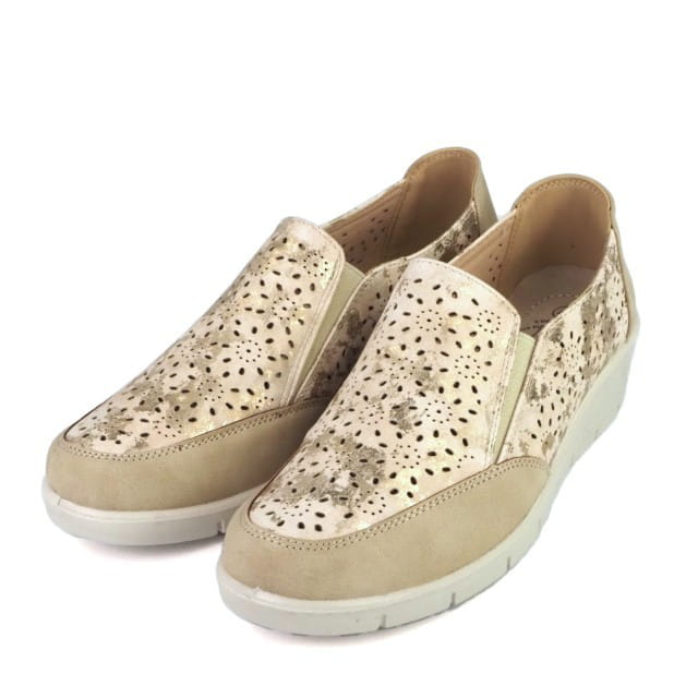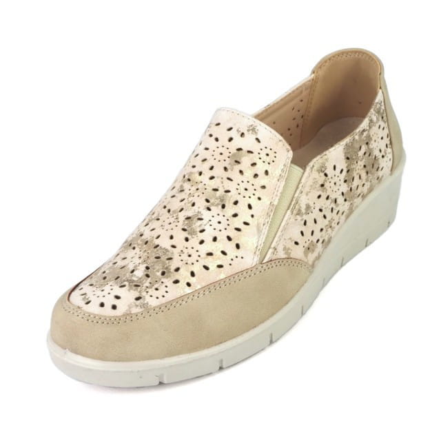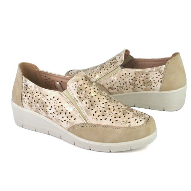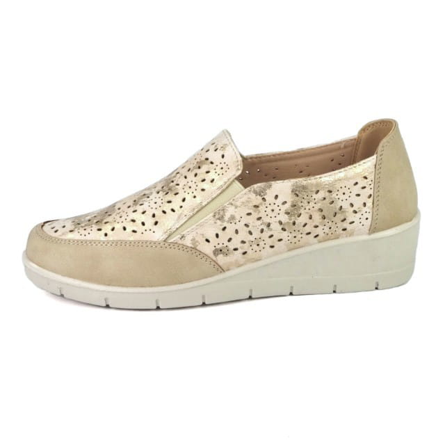 Beżowe, komfortowe, szerokie półbuty damskie typu mokasyny marki Dr. Jan. Ażurowa cholewka jest wykonana z wysokiej jakości i miękkości skóry ekologicznej w kolorze beżowym. Wyściółka jest ze skóry ekologicznej. Komfortu dodaję miękka wkładka ze skóry naturalnej. Buty są wkładane i mają dwie gumki po bokach dla lepszej wsuwalności. Uroku dodają delikatne, złote wzorki na cholewce. Podeszwa jest lekka, trwała i elastyczna. Wygodny klin ma wysokość 4 cm. Idealne półbuty sprawdzą się w codziennym użytkowaniu.