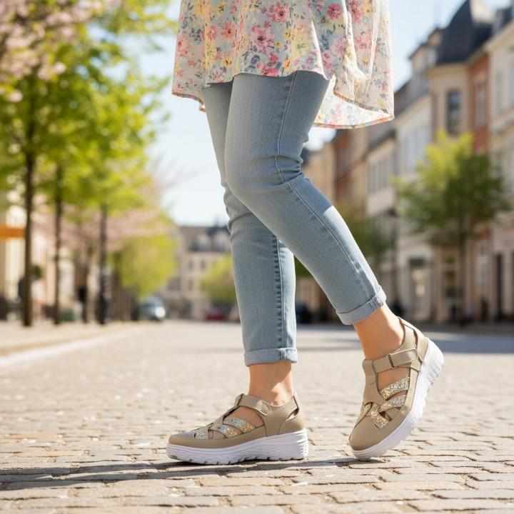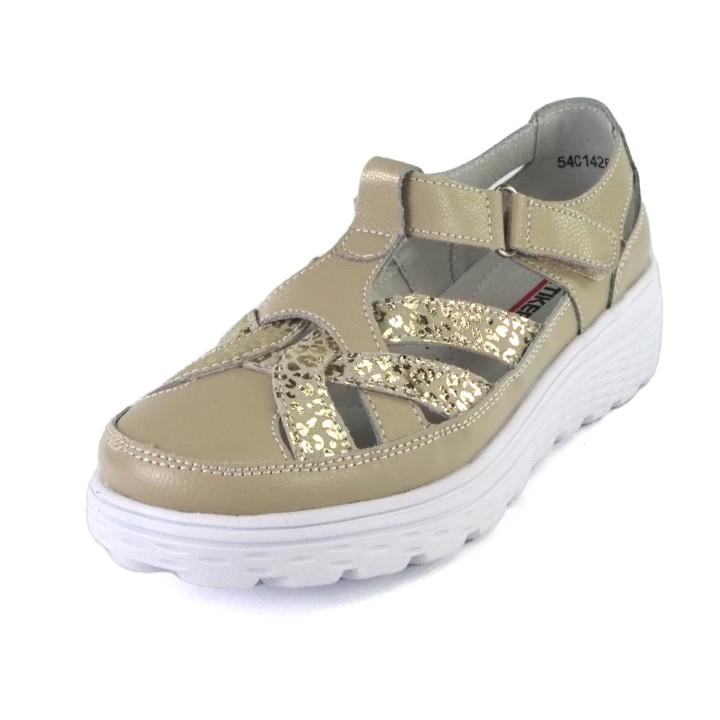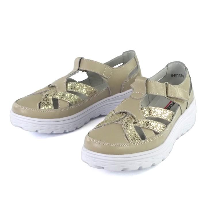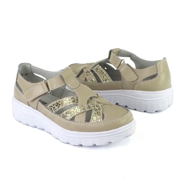 Beżowe, super lekkie i wygodne półbuty damskie znanej marki Artiker. Ażurowa cholewka wykonana jest z wysokiej jakości i miękkości skóry naturalnej w beżowym kolorze ze złotą wstawką. Komfortowa wkładka jest miękka i skórzana. Buty zapinane są na rzep. Podeszwa jest bardzo lekka, elastyczna i trwała o komfortowej wysokości 4 cm. Modne i wygodne półbuty będą idealne do codziennego użytowania od wiosny do jesieni.