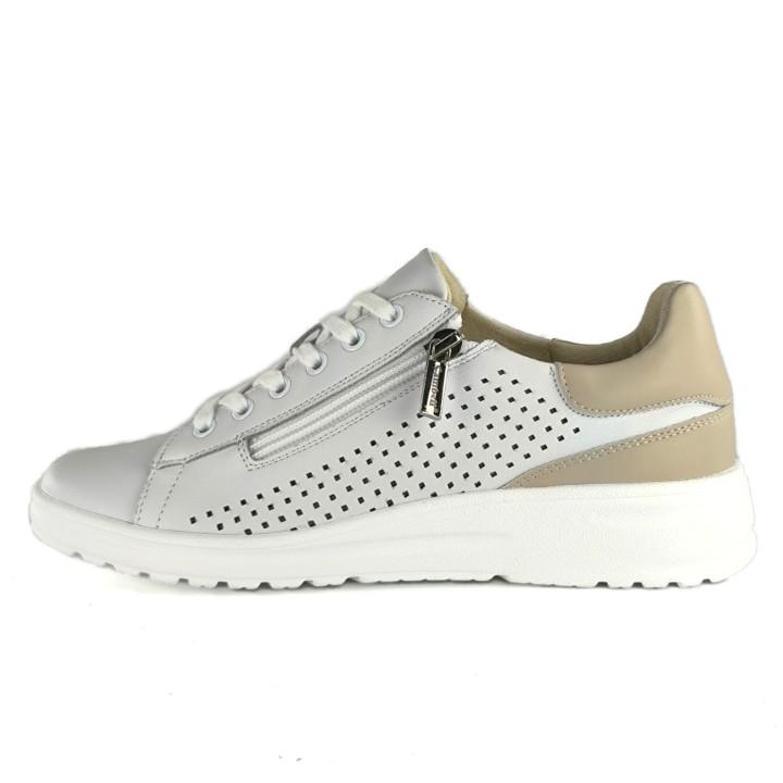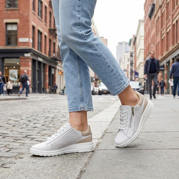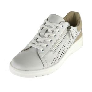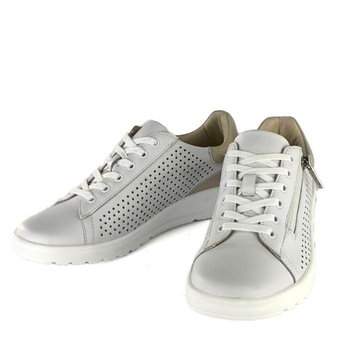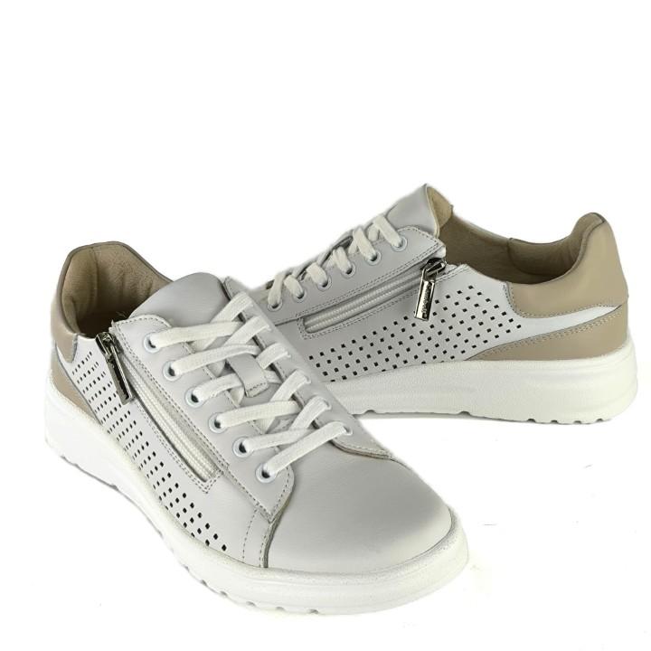 Białe, modne i wygodne półbuty damskie znanej marki Cambell. Cholewka wykonana jest z wysokiej jakości i miękkości skóry naturalnej licowej w kolorze białym. Komfortowa wkładka jest miękka i skórzana. Buty są sznurowane i mają suwak z boku. Tegość G. Podeszwa jest elastyczna, lekka i trwała. Wygodny klin ma wysokość 3,5 cm. Uroku dodają beżowe wstawki i lekko dziurkowana cholewka po bokach. Ponadczasowe i komfortowe półbuty będą pasować do różnych stylizacji, będą także idealne do codziennego użytowania.