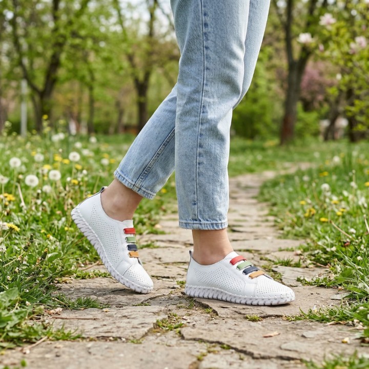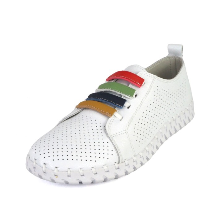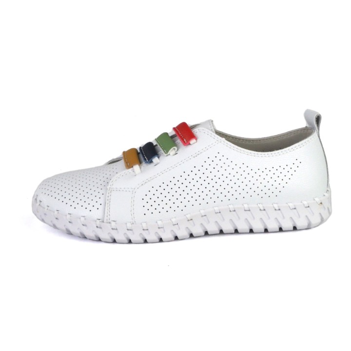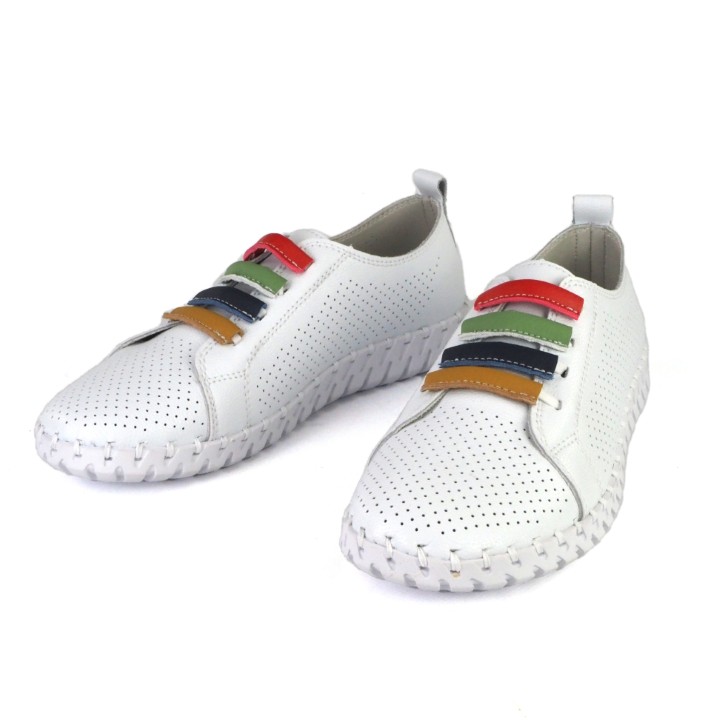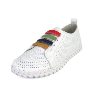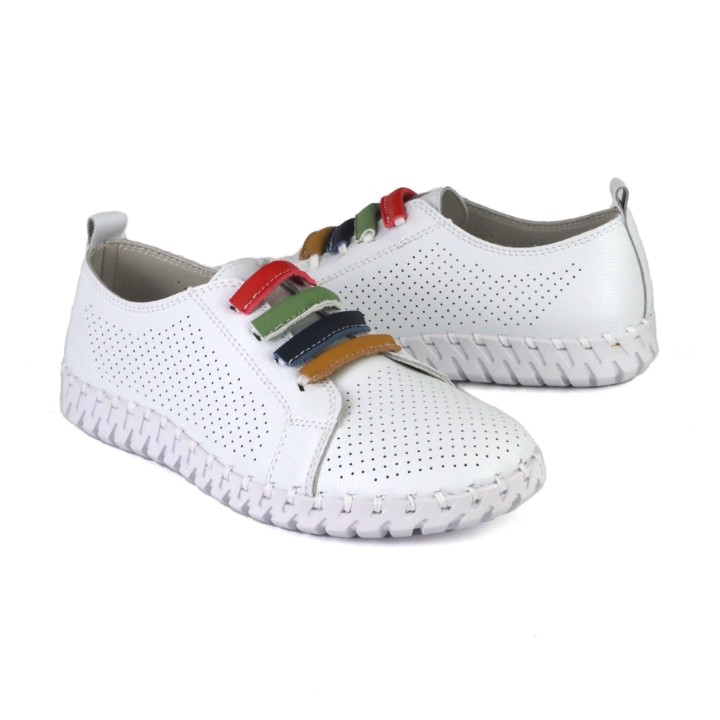 Białe, modne i wygodne półbuty damskie znanej marki Cambell. Ażurowa cholewka wykonana jest z wysokiej jakości i miękkości skóry naturalnej licowej w kolorze białym. Komfortowa wkładka jest miękka i skórzana. Buty mają sznurówki gumki, co ułatwia zakładanie i zdejmowanie obuwia. Tegość G. Podeszwa jest elastyczna, lekka i trwała. Wygodny klin ma wysokość 2,5 cm. Uroku dodają kolorowe wstawki z przodu . Ponadczasowe i komfortowe półbuty będą pasować do różnych stylizacji, będą także idealne do codziennego użytowania.