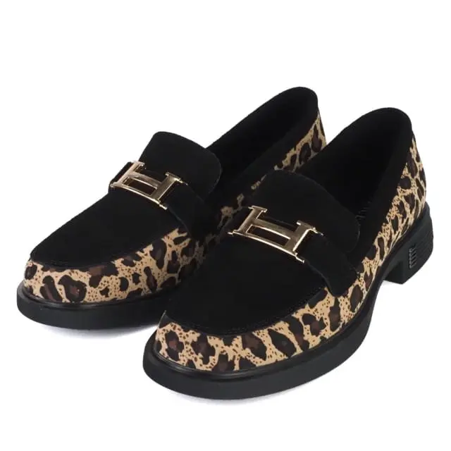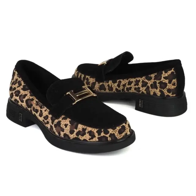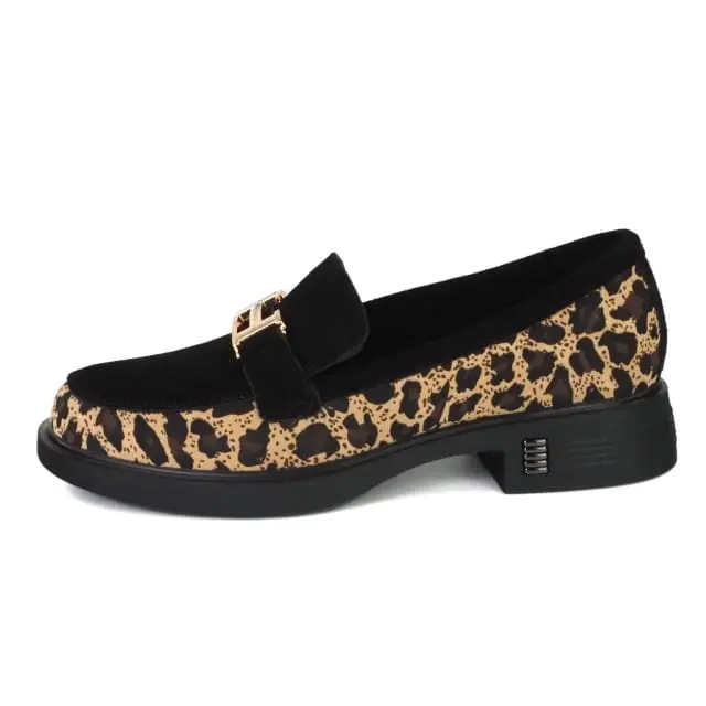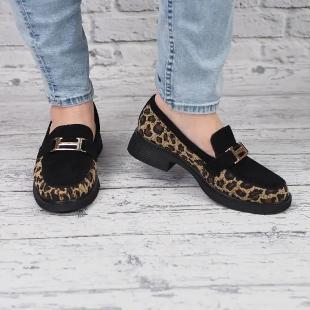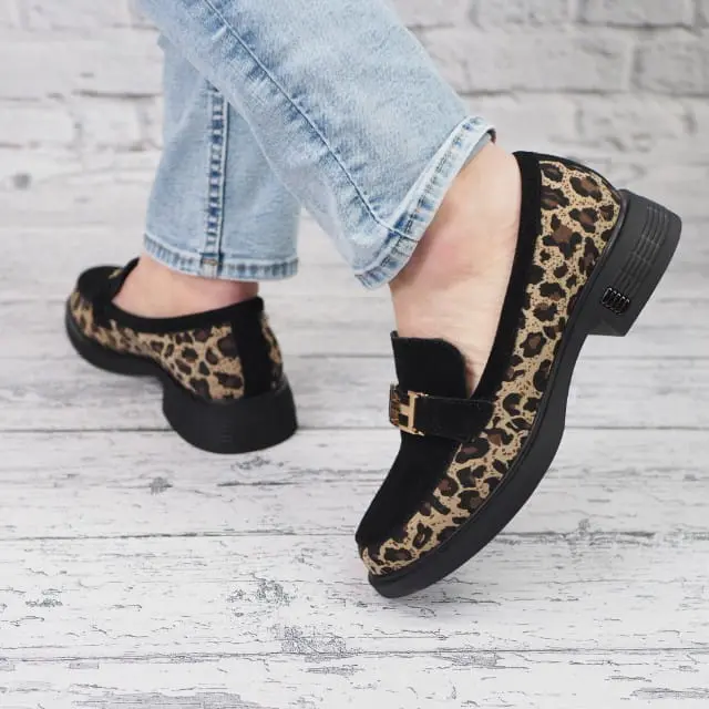 Efektowne i wygodne półbuty damskie typu mokasyny znanej firmy Vinceza. Cholewka wykonana jest z wysokiej jakości i miękkości skóry naturalnej zamszowej w pięknym zestawie kolorystycznym czarny ze wstawkami panterki. Miękka, komfortowa wkładka jest ze skóry naturalnej. Buty mają modną, elastyczną i trwałą podeszwę. Wysokość obcasa 3 cm. Tęgość G. Ładna ozdoba z przodu i oryginalna kolorystyka zwiększają atrakcyjny wygląd. Szykowne i komfortowe półbuty będą ozdobą niejednej stylizacji. Idealne do codziennego użytkowania.