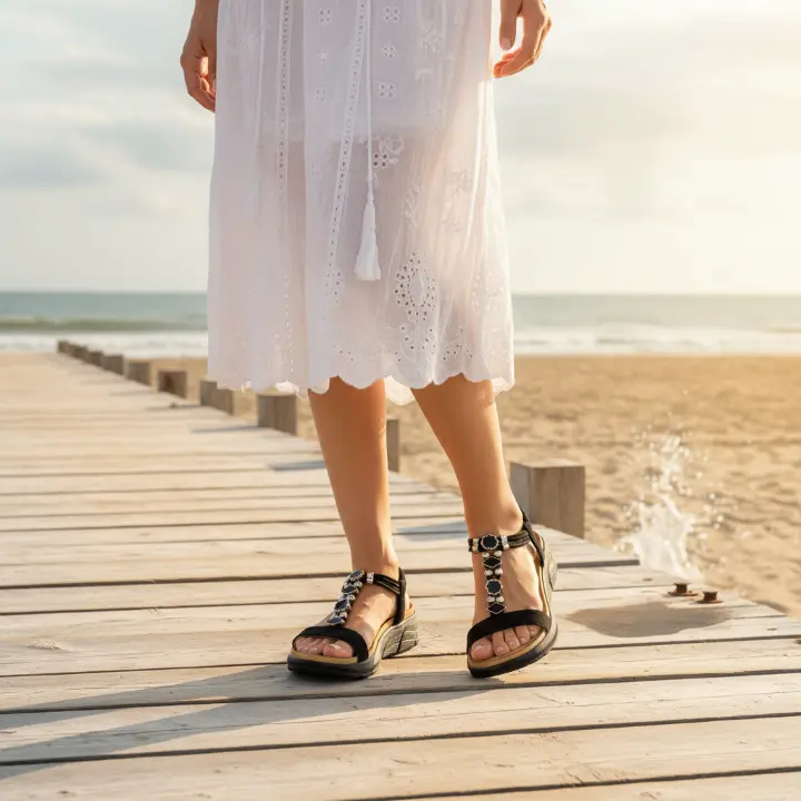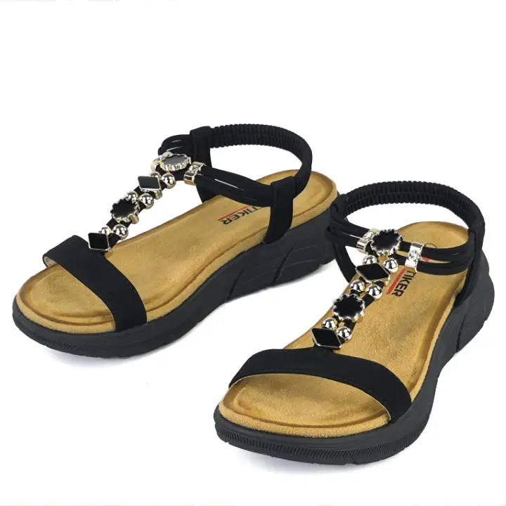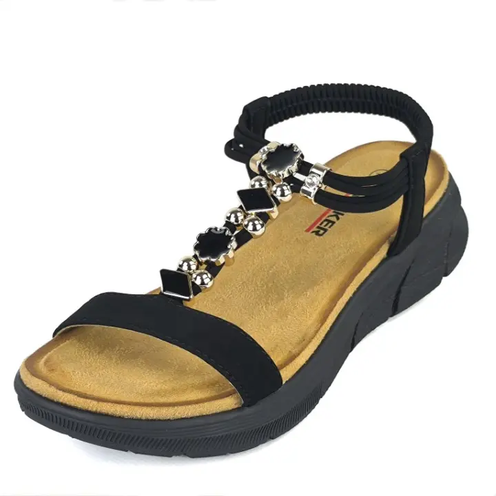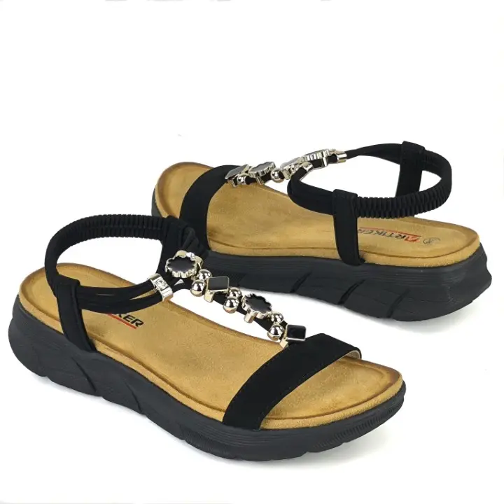 Czarne, modne i stylowe sandały damskie marki Artiker. Cholewka jest wykonana z wysokiej jakości i miękkości skóry ekologicznej. Miękka, wygodna wkładka jest z materiału tekstylnego. Podeszwa jest komfortowa, elastyczna i trwała. Wygodny klin ma wysokość 4 cm. Buty są wkładane, pasek z tyłu jest na gumkę. Sandały są w czarnym kolorze. Uroku dodaje prześliczna ozdoba z przodu. Inspirowane najgorętszymi trendami sezonu, wygodne sandały, pięknie wyglądają na nodze. Będą ozdobą niejednej stylizacji.