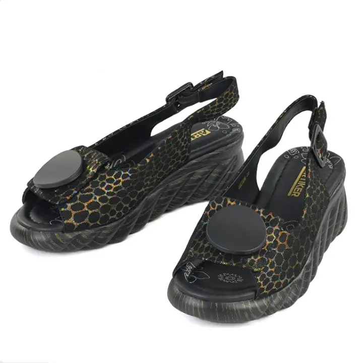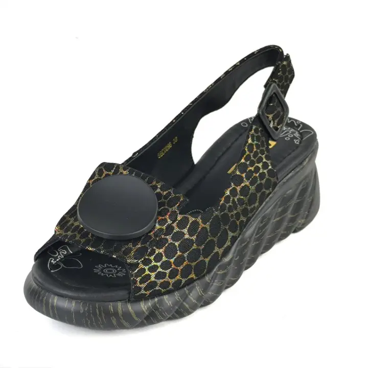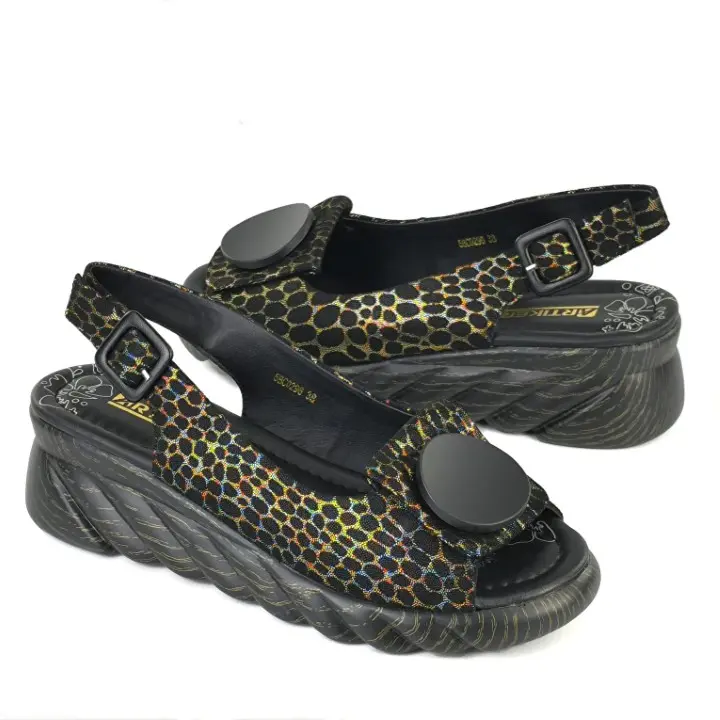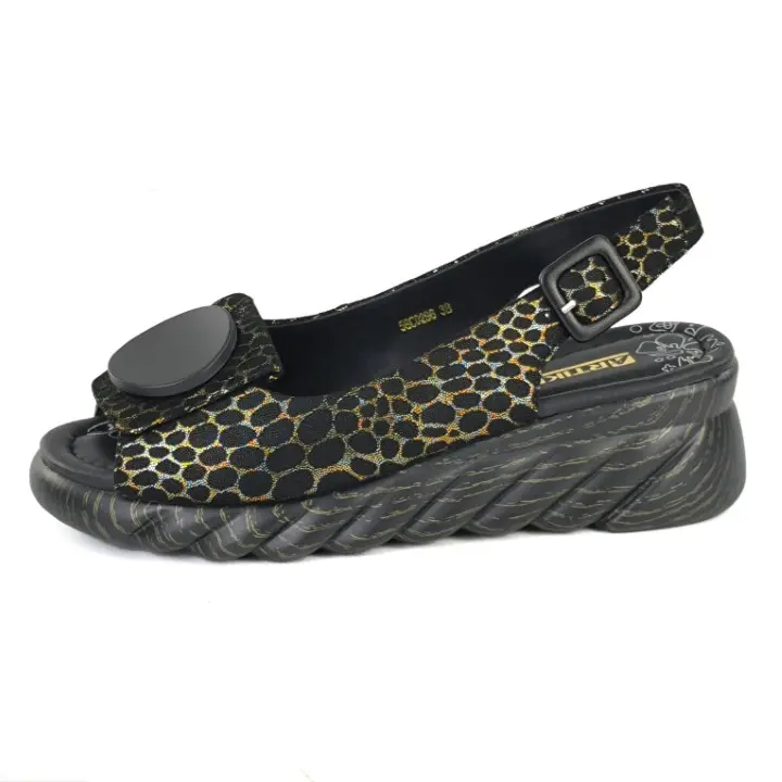 Czarno-złote, gustowne i stylowe sandały damskie marki Artiker. Cholewka jest wykonana z wysokiej jakości i miękkości skóry naturalnej w efektownym kolorze czarno-złotym. Miękka, wygodna wkładka jak i wyściółka są ze skóry ekologicznej. Podeszwa jest lekka , elastyczna i trwała. Fantazyjny koturn ma wysokość 5,5 cm. Buty są zapinane na klamerkę z boku. Modny kolor, ładna ozdoba z przodu i ciekawy koturn dodają uroku. Inspirowane najgorętszymi trendami sezonu, modne sandały, sprawdzą się w niejednej stylizacji. Kobiecy szyk.