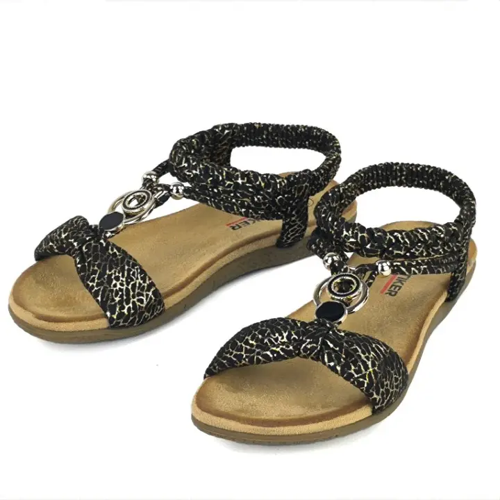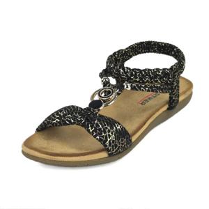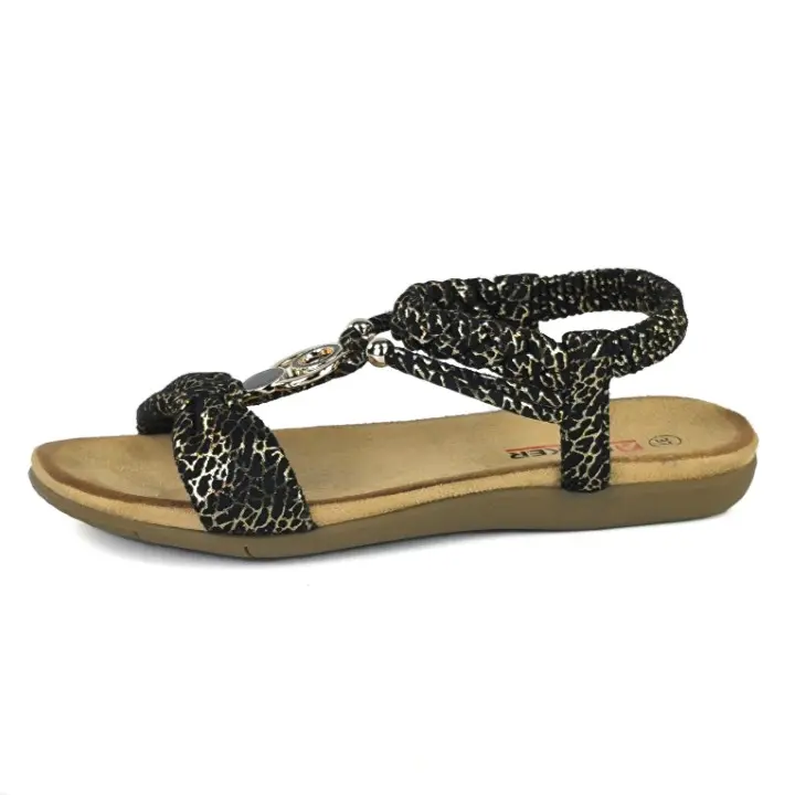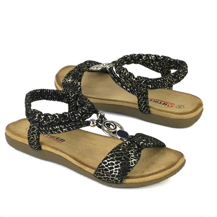 Czarno-złote, modne i stylowe sandały damskie marki Artiker. Cholewka jest wykonana z wysokiej jakości i miękkości materiału tekstylnego. Miękka, wygodna wkładka jak i wyściółka są z materiału tekstylnego. Podeszwa jest wygodna, elastyczna i trwała. Buty są wkładane, pasek z tyłu jest na gumkę. Użyty materiał dopasowuje się do tęgości stopy. Sandały są w czarnym lekko złoconym kolorze. Śliczna ozdoba z przodu dodaje uroku i ładnie wygląda na stopie. Inspirowane najgorętszymi trendami sezonu, piękne sandały, sprawdzą się w niejednej stylizacji. Kobiecy szyk.