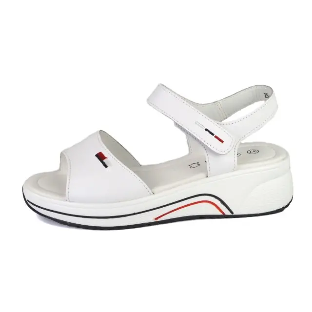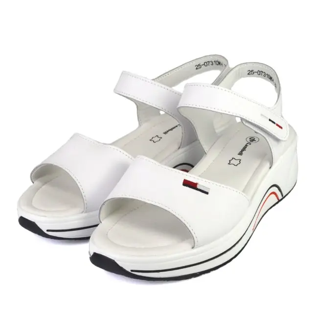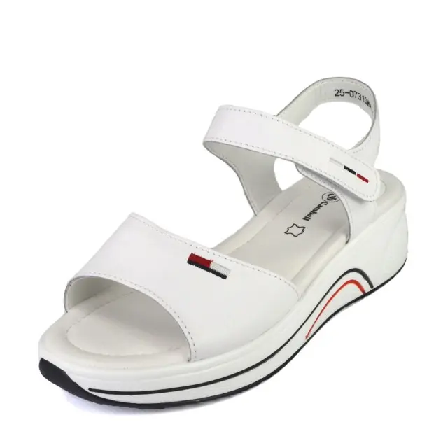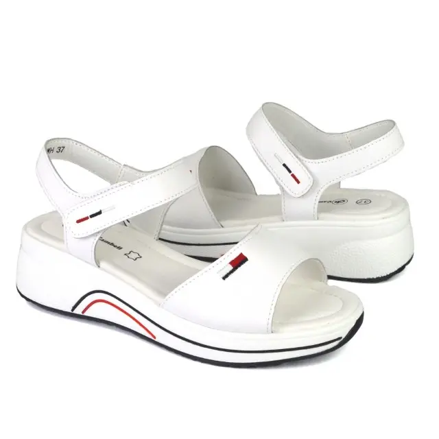 Białe, lekkie i wygodne sandały damskie znanej marki Cambell. Cholewka wykonana jest z wysokiej jakości i miękkości skóry naturalnej licowej w kolorze białym. Komfortowa wkładka jest miękka i ze skóry ekologicznej. Buty zapinane są na rzep. Tegość G. Podeszwa jest modna, lekka i trwała. Delikatne wstawki czerwono-granatowe dodają uroku. Podeszwa ma wysokość 4,5 cm. Ponadczasowe, stylowe sandały będą pasować do różnych stylizacji, będą także idealne do codziennego użytowania.