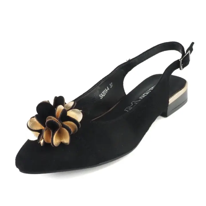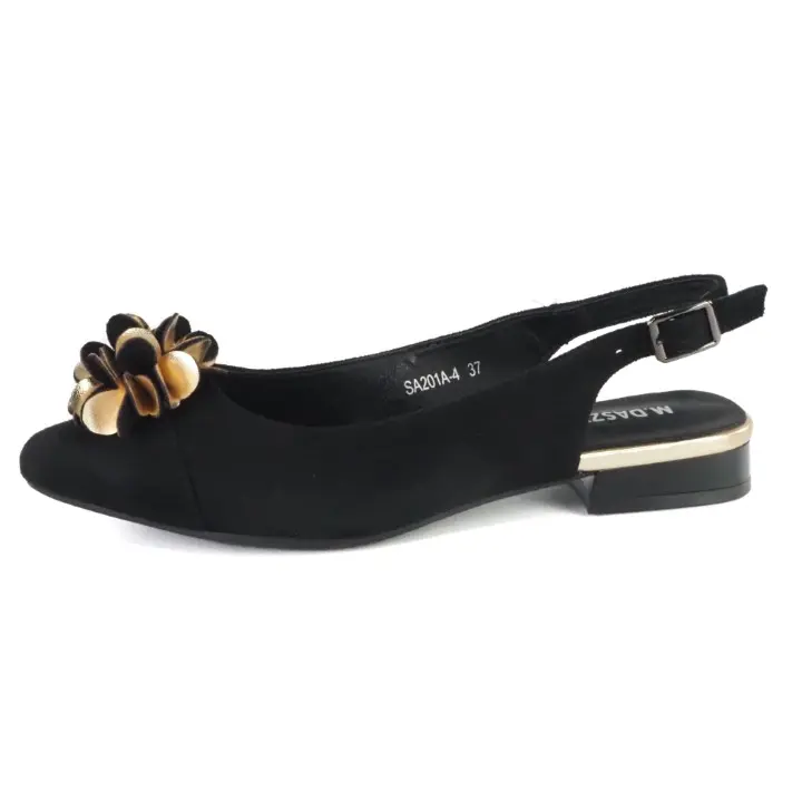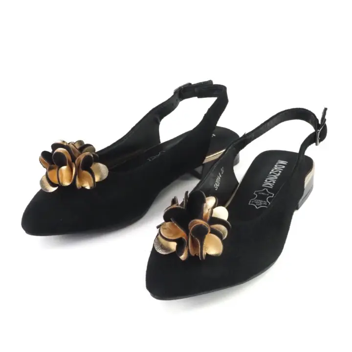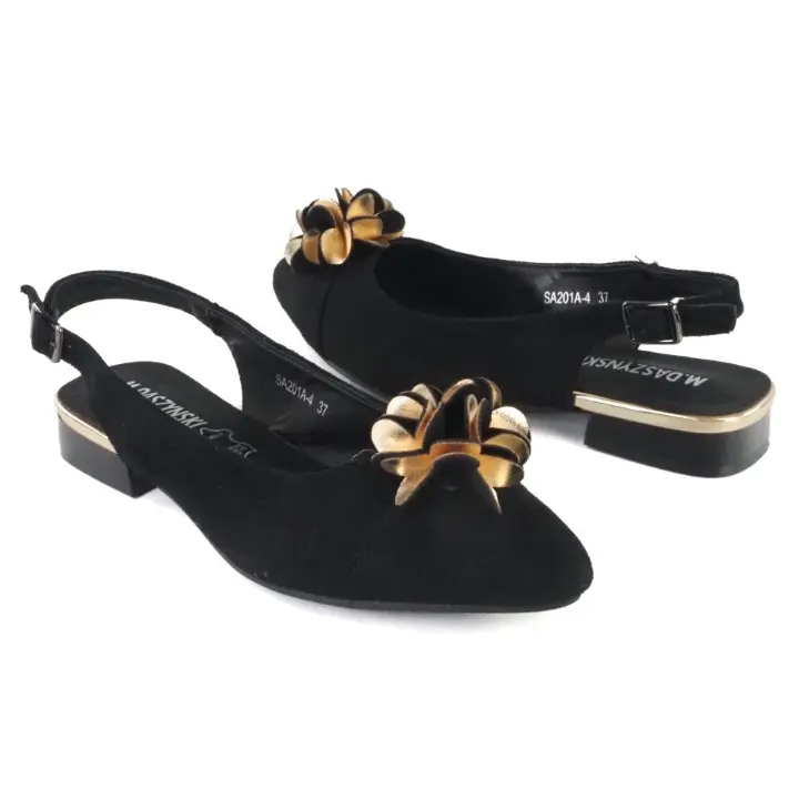 Szykowne, modne i komfortowe sandały damskie znanej marki M.Daszyński. Cholewka jest wykonana z wysokiej jakości i miękkości materiału tekstylnego imitującego nubuk w kolorze czarnym. Wkładka jest miękka, ze skóry naturalnej. Buty są zapinane na klamerkę z boku. Uroku dodaje elegancka, złota ozdoba z przodu. Podeszwa jest elastyczna i trwała. Niski, wygodny obcas ma wysokość 2 cm. Sandały M.Daszyński to doskonały wybór dla kobiet ceniących elegancję i modny styl. Kobiece, efektowne sandały sprawdzą się na co dzień i na wielkie okazje.