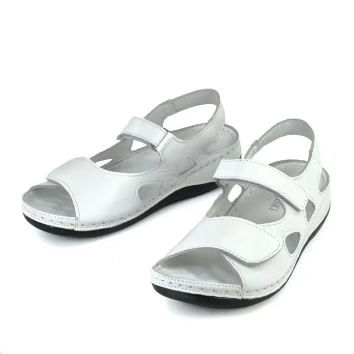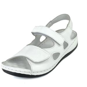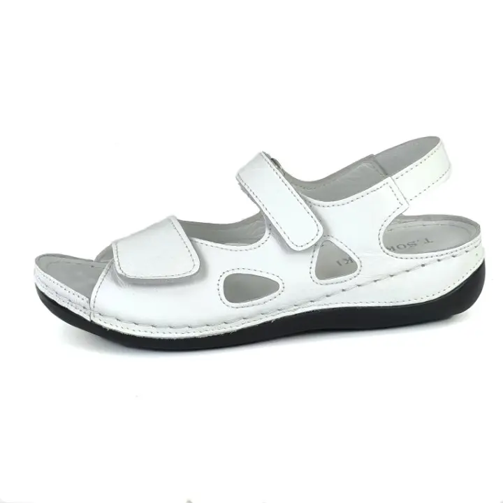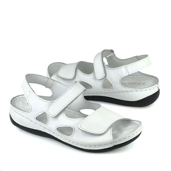Białe, lekkie i modne sandały damskie marki T.Sokolski. Cholewka jest wykonana z wysokiej jakości i miękkości skóry naturalnej w kolorze białym. Wkładka jest delikatnie perforowana, miękka i skórzana. Wyściółka jest ze skóry naturalnej. Podeszwa jest lekka i elastyczna. Buty mają dwa paski zapinane na rzep, aby lepiej dopasować do stopy. Niewysoki, wygodny koturn ma wysokość 4 cm. Wygodne sandały sprawdza się w letnie i upalne dni.