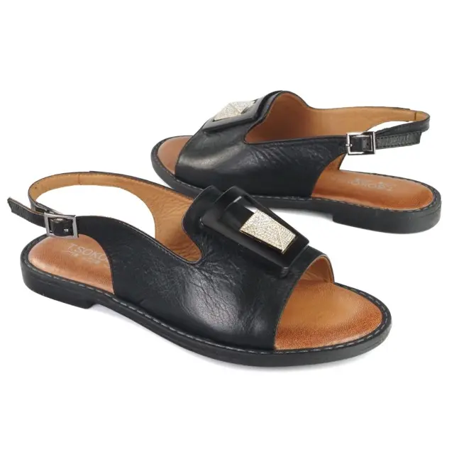 Stylowe i komfortowe sandały damskie marki T. Sokolski. Cholewka jest wykonana z wysokiej jakości i miękkości skóry naturalnej w kolorze czarnym. Miękka wkładka, jak i wyściółka są ze skóry naturalnej. Buty są zapinane na klamerkę z boku. Podeszwa jest lekka, wygodna i trwała. Wygodny, niski obcas ma wysokość 1,5 cm. Ładnie wykrojona cholewka i oryginalna ozdoba z przodu zwiększają atrakcyjny wygląd butów. Szykowne i wygodne sandały sprawdzą się w letnie, upalne dni do różnych stylizacji.