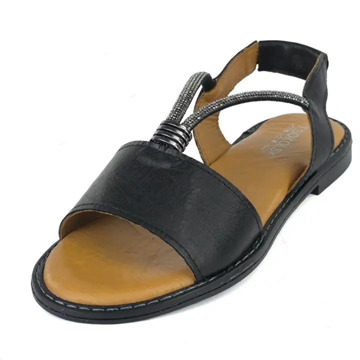 Czarne, lekkie i modne sandały damskie marki T.Sokolski. Cholewka jest wykonana z wysokiej jakości i miękkości skóry naturalnej w kolorze czarnym Wkładka jest miękka i skórzana. Podeszwa jest lekka i elastyczna. Buty są wkładane, pasek na pięcie ma 2 gumki dla lepszej wsuwalności. Wygodny obcas ma wysokość 2 cm. Ozdobne paseczki ładnie wyszczuplają stopę. Delikanta ozdoba wraz z efektownymi paseczkami zwiększają atrakcyjny wygląd butów. Modne i wygodne sandały sprawdzą się w letnie i upalne dni. Idealne do wielu stylizacji.