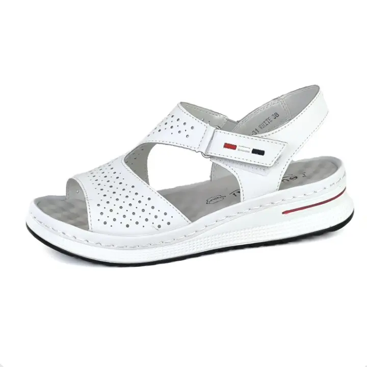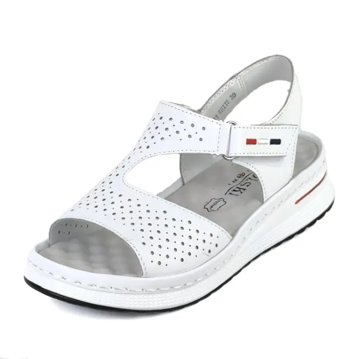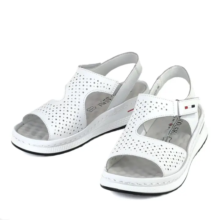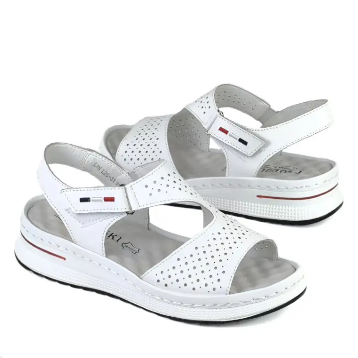 Białe, lekkie i modne sandały damskie marki T.Sokolski. Cholewka jest wykonana z wysokiej jakości i miękkości skóry naturalnej w kolorze białym. Wkładka jest delikatnie perforowana, miękka i skórzana. Podeszwa jest lekka i elastyczna. Buty są zapinane na rzep. Niewysoki, wygodny koturn ma wysokość 4 cm. Ładna ażurowa cholewka i delikatne wstawki dodają uroku. Wygodne i ponadczasowe sandały sprawdzą się w letnie i upalne dni. Idealne do wielu stylizacji.