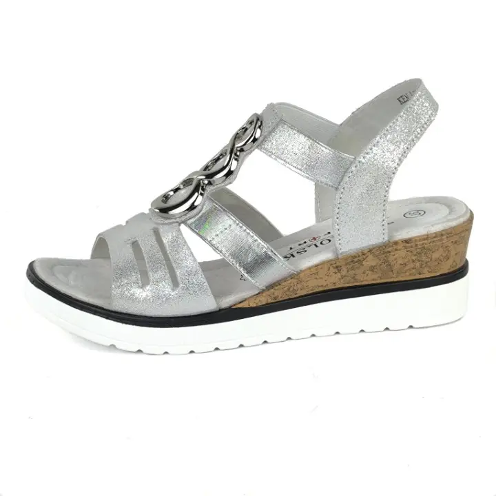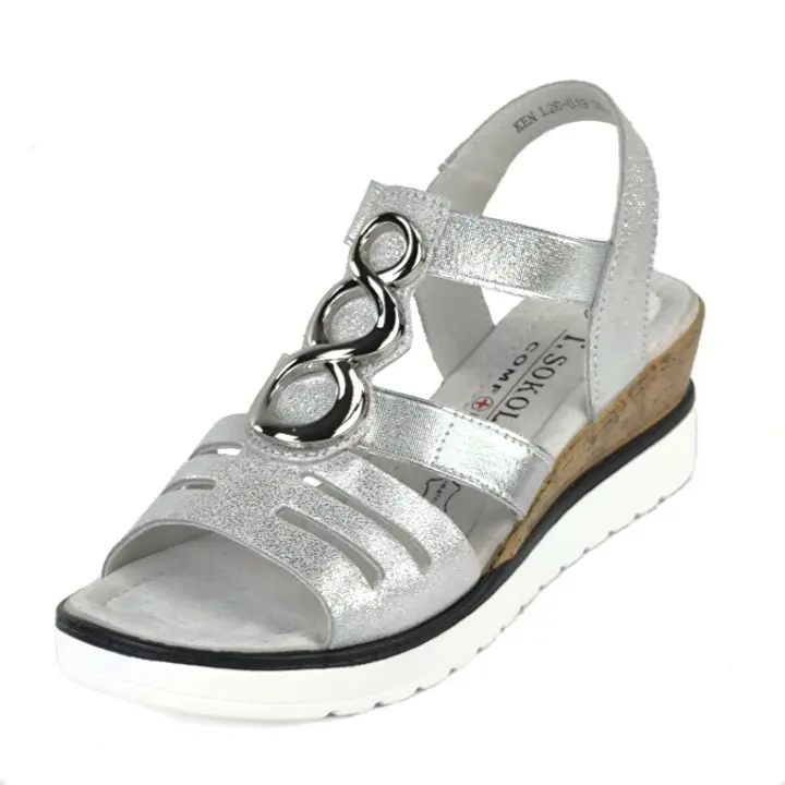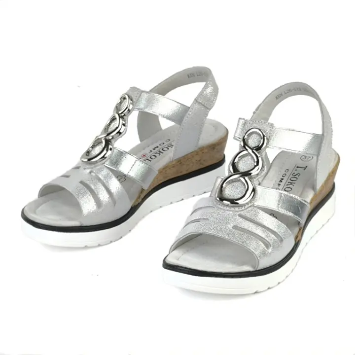Srebrne, modne i efektowne sandały damskie marki T.Sokolski. Cholewka jest wykonana z wysokiej jakości i miękkości skóry naturalnej w kolorze srebrnym. Miękka wkładka jest wykonana ze skóry naturalnej. Podeszwa jest lekka i trwała. Buty są wkładane, paski po bokach są wykonane ze srebrnej gumy. Wygodny koturn ma wysokość 5,5 cm, a podsuwka 2 cm. Śliczna, srebrna ozdoba z przodu oraz kolorowa podeszwa zwiększają atrakcyjny wygląd. Gustowne i ponadczasowe sandały sprawdzą się w letnie i upalne dni. Idealne do wielu stylizacji.