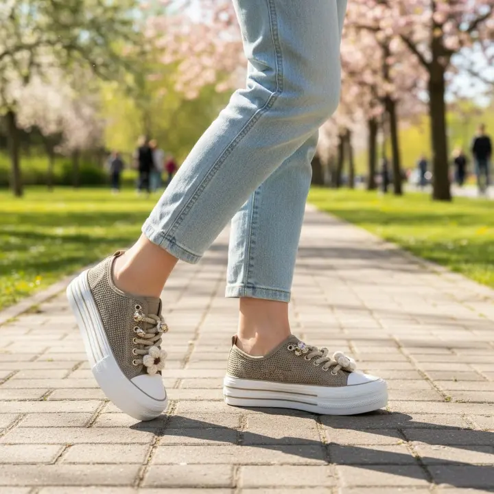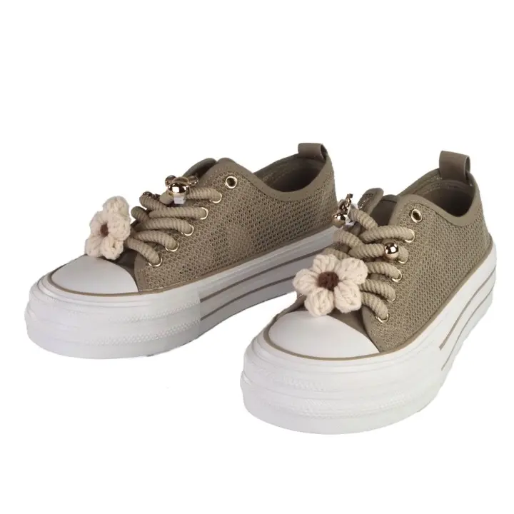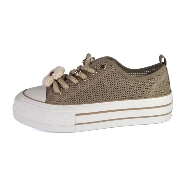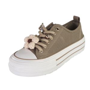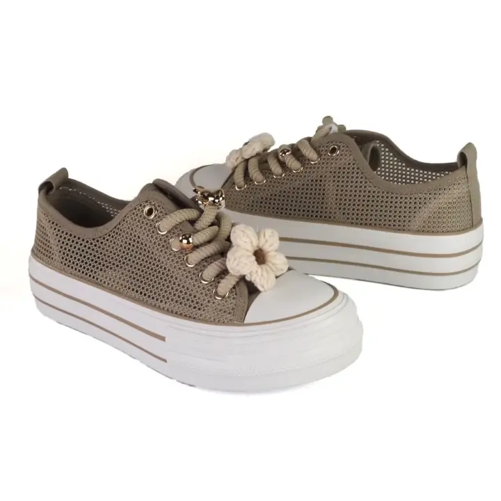 Beżowe, modne i szykowne obuwie sportowe typu trampki damskie znanej marki Filippo. Cholewka jest wykonana z wysokiej jakości materiału tekstylnego typu siateczka w kolorze beżowym. Miękka wkładka jak i wyściółka są z materialu tekstylnego. Buty są sznurowane i mają gumowy nosek. Ozdoby na sznurówkach można zdjąć. Efektowna podeszwa platforma jest solidna i trwała i ma wysokość 4 cm. Modny design i oryginalne ozdoby zwiększają atrakcyjny wygląd butów. Inspirowane najgorętszymi trendami sezonu, świetnie pasują do wielu stylizacji.