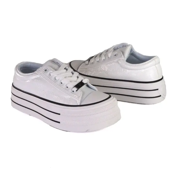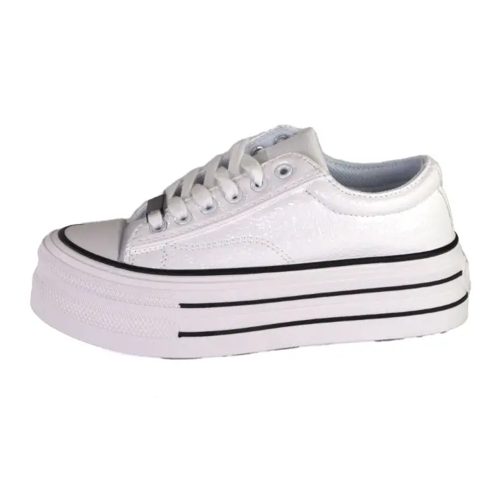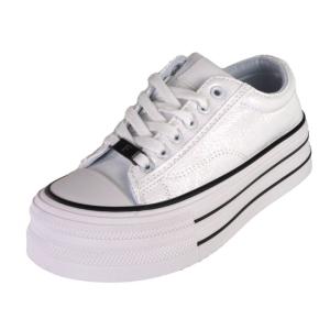 Białe, modne i szykowne obuwie sportowe typu trampki damskie znanej marki Filippo. Cholewka jest wykonana z wysokiej jakości skóry ekologicznej lekko lakierowanej w kolorze białym. Miękka wkładka jak i wyściółka są z materialu tekstylnego. Buty są sznurowane i mają gumowy nosek. Modna podeszwa platforma jest solidna i trwała i ma wysokość 5 cm. Modny design i czarne wstawki na podeszwie zwiększają atrakcyjny wygląd butów. Inspirowane najgorętszymi trendami sezonu, świetnie pasują do wielu stylizacji.