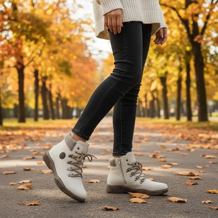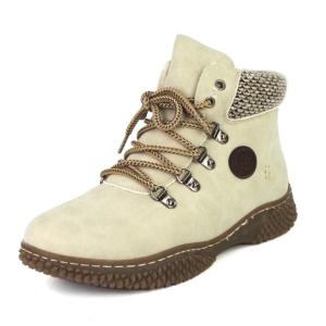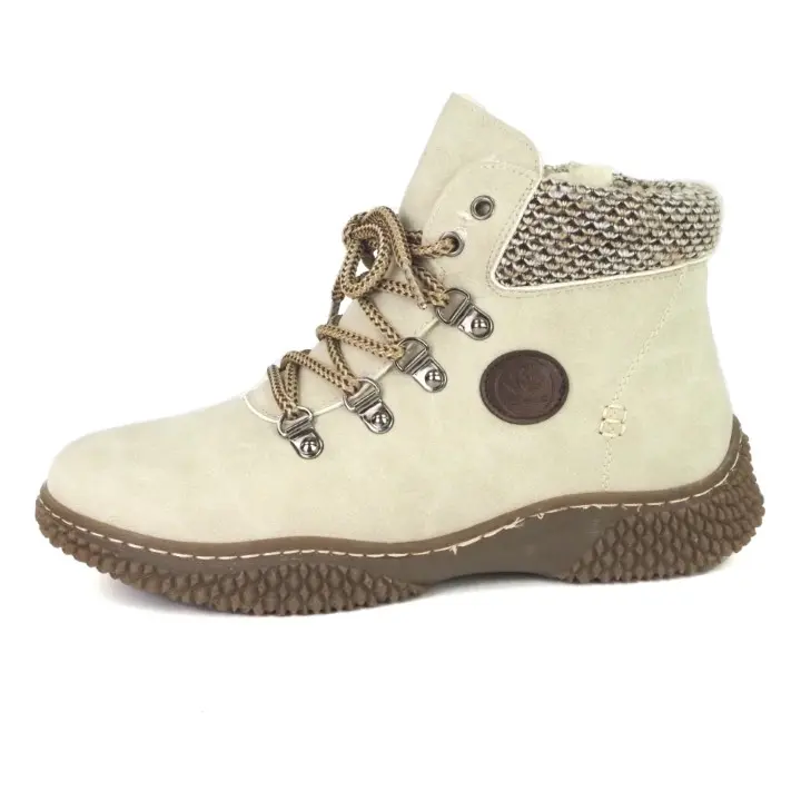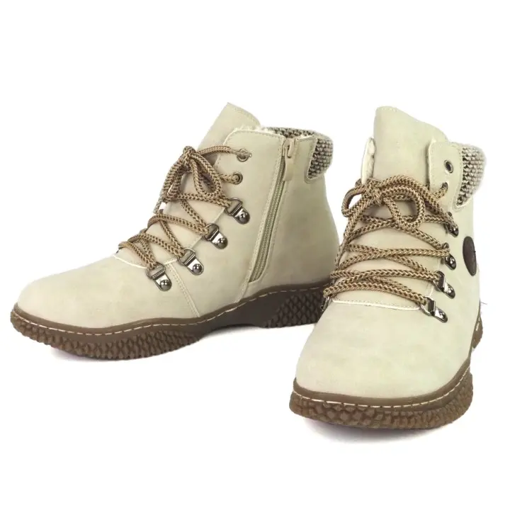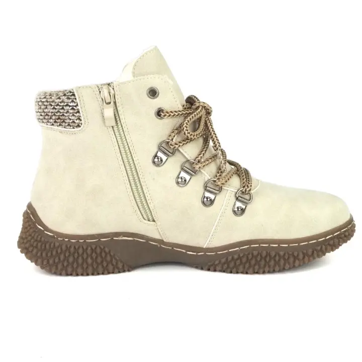 Ponadczasowe i lekkie trzewiki damskie marki Unisoft. Cholewka jest wykonana z wysokiej jakości i miękkości skóry ekologicznej w modnym, beżowym kolorze. Wewnątrz buty są ocieplone futerkiem. Są sznurowane i mają suwak z boku dla lepszej wsuwalności. Podeszwa jest lekka, elastyczna i trwała i dzięki bieżnikowi ma dobrą przyczepność do podłoża. Ciekawe materiałowe wstawki i ładna ozdoba dodają uroku butom. Idealne trzewiki na co dzień w zimne dni. Będą się wyróżniać w wielu stylizacjach.