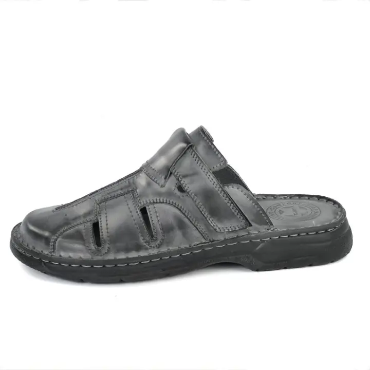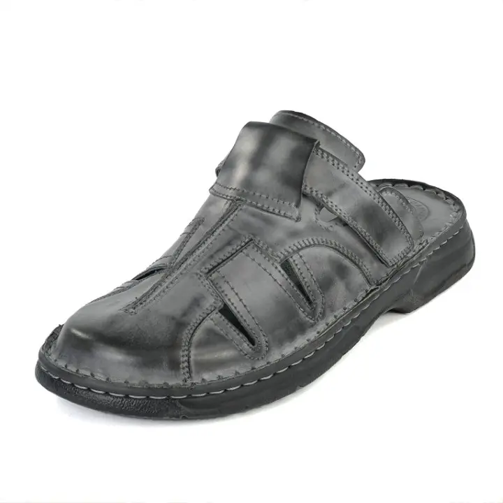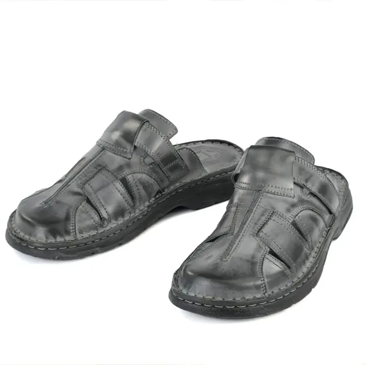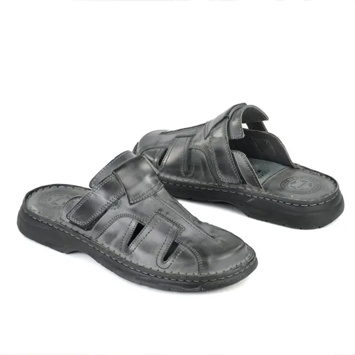 Szare, modne klapki męskie, polskiej produkcji, marki Łukpol. Cholewka wykonana z wysokiej jakości i miękkości skóry naturalnej w ładnym kolorze grafitowym. Niewielkie różnice w odcieniu i powierzchni skóry w obu półparach należy traktować jako naturalne zalety autentyczności i szlachetności. Klapki mają regulowany pasek na rzep. Komfort użytkowania podnoszą zastosowane otwory w cholewce zapewniające wentylację i miękka, skórzana wkładka. Podeszwa jest elastyczna i trwała. To ten rodzaj obuwia, który sprawdzi się jako letnie obuwie domowe, weekendowe i wakacyjne do codziennego użytkowania.