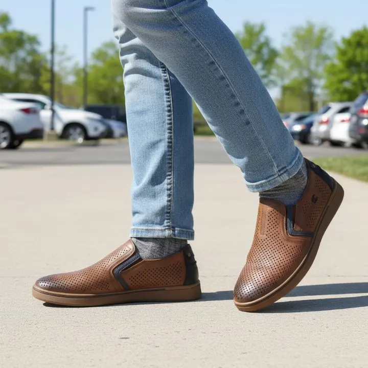 Brązowe, komfortowe i ponadczasowe półbuty męskie typu mokasyny marki Unisoft . Cholewka jest wykonana z wysokiej jakości i miękkości skóry ekologicznej w kolorze brąz przecierany. Wkładka jest wykonana ze skóry naturalnej. Buty są wkładane i mają dwie gumki po bokach dla lepszej wsuwalności. Wysoki komfort użytkowania zapewnia miękka wkładka, która dopasowuje się do stopy i absorbuje wstrząsy. Podeszwa jest lekka, elastyczna i trwała. Ciekawe wstawki i ładny, przecierany kolor brązu dodają uroku. Wygodne i modne obuwie sprawdzi się w codziennym użytkowaniu.