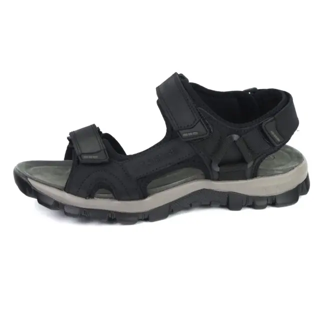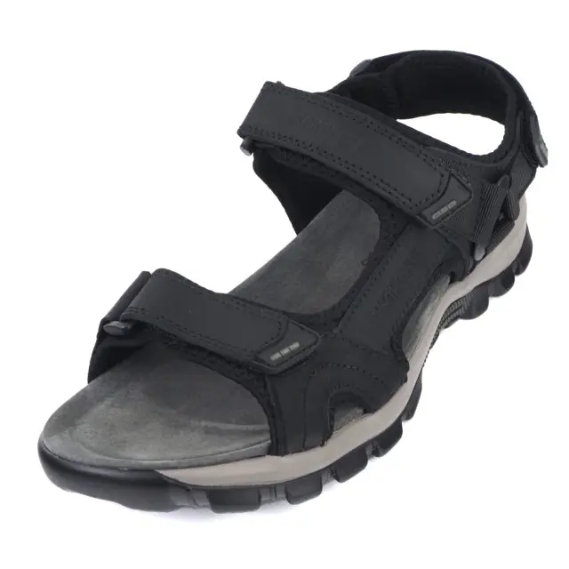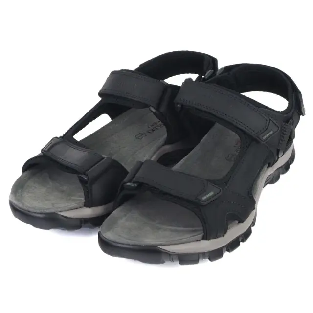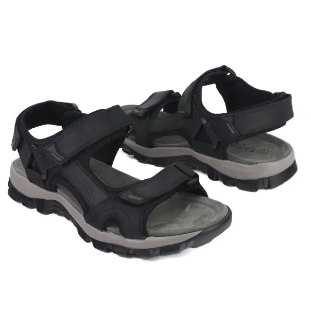 Modne i komfortowe sandały męskie marki T.Sokolski. Cholewka jest wykonana z wysokiej jakości skóry naturalnej nubukowej w kolorze czarnym. Miękka wkładka jest wykonana ze skóry naturalnej i jest delikatnie profilowana. Podeszwa jest lekka, elastyczna i trwała. Buty są zapinane na 3 rzepy, dzięki czemu można idealnie dopasować do stopy. Modna dwukolorowa podeszwa i ciekawy fason zwiększają atrakcyjny wygląd. Stylowe i ponadczasowe sandały sprawdzą się w codziennym użytkowaniu od wiosny do jesieni.